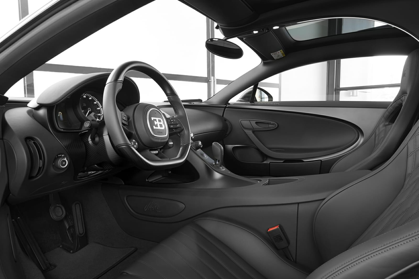 In the "Chiron Noire Sportive" Bugatti covers the visible carbon fiber with a matt black finish. All exterior trim parts, the C-shaped Bugatti signature line, the wheels, the front spoiler and the radiator grille are kept in matt black. The four visible tailpipes of the titanium exhaust system are painted black, as are parts of the engine cover. In the interior, black dominates even more than in the "Chiron Noire Élégance". Bugatti has the embroidered "Noire" lettering on the inlays in the center console and the headrest in black as well as the aluminum trim in the interior. The inner C-line, switches, buttons and knobs on the dashboard, steering wheel, center console and door handles underline the exclusive, sporty character in matt black.